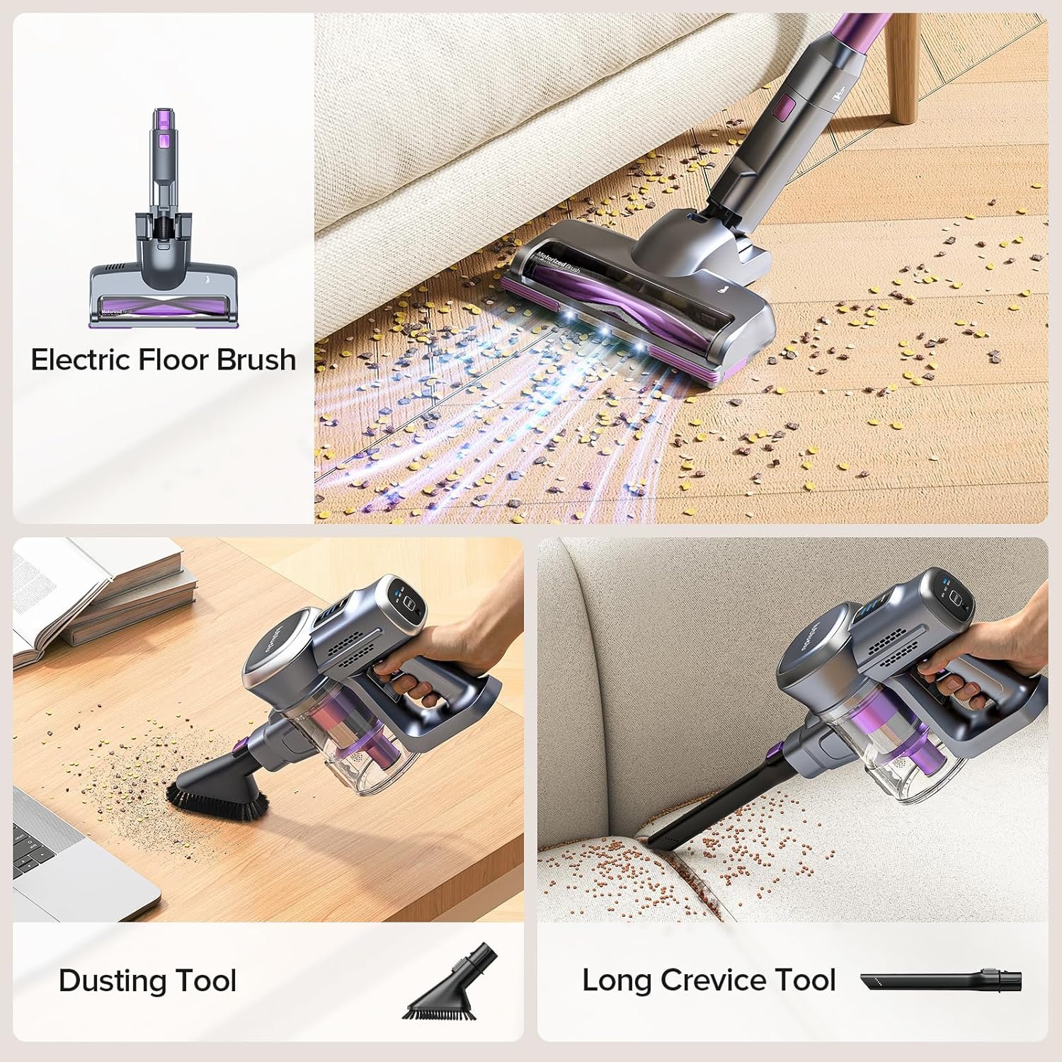 • 🎄[3 Powerful Suction Modes] The cordless vacuum cleaner equipped with a 350W upgraded brushless motor with 28Kpa Powerful suction on Max mode. The excellent performance can help you deal with all varieties of dust and dirt such as pet hair, cat litter, dog food with ease!